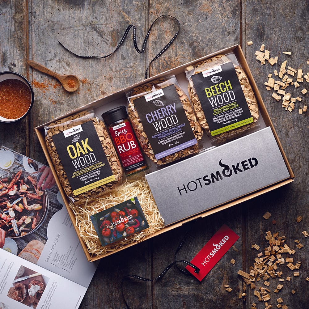 Bring the amazing flavours of wood smoke to your outdoor cooking with our BBQ Hot Smoking Kit. This multi award winning kit contains all you need to turn your BBQ into a Hot Smoker including three different wood smoking chip flavours in Oak, Cherry and Beech, our solid stainless steel smoker box, a Spicy BBQ Rub plus a 24 page recipe booklet and our useful Guide to Wood Smoke Flavours. Gift boxed with a printed sleeve, this starter kit makes a fabulous gift for all outdoor foodie cooks and BBQ enthusiasts. Suitable for use on a BBQ or smoker, charcoal or gas heat source.