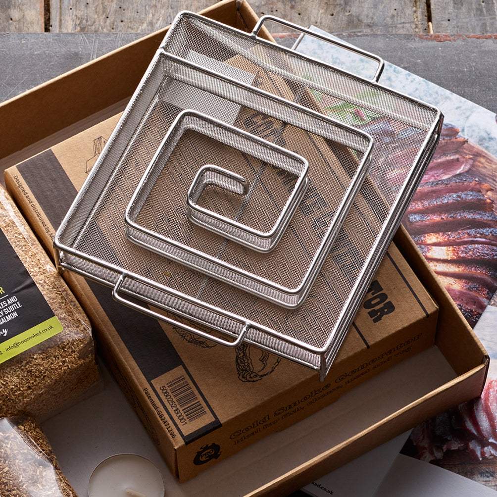Featuring the ProQ Cold Smoke Generator, this 15cm square mesh maze is the key to creating mellow cooled wood smoke flavour, without the heat. We’ve added 3 different flavours of fine wood dust in Beech, Maple and Oak providing mild to strong smoke, and our recipe booklet/ instructions leaflet can be downloaded HERE.