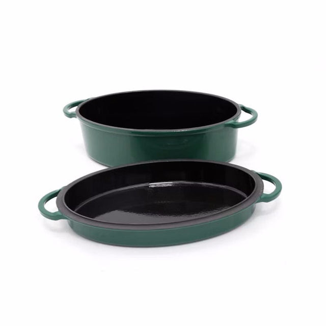 Our 5.2 litre oval Enamelled Dutch Oven will be your faithful friend for slow-cooking, simmering, braising, and baking for many years to come. Not only do you get two pans for the price of one — the lid can be used separately from the main dish or you can combine the two for stews and casseroles — but both elements also make great serving dishes.
