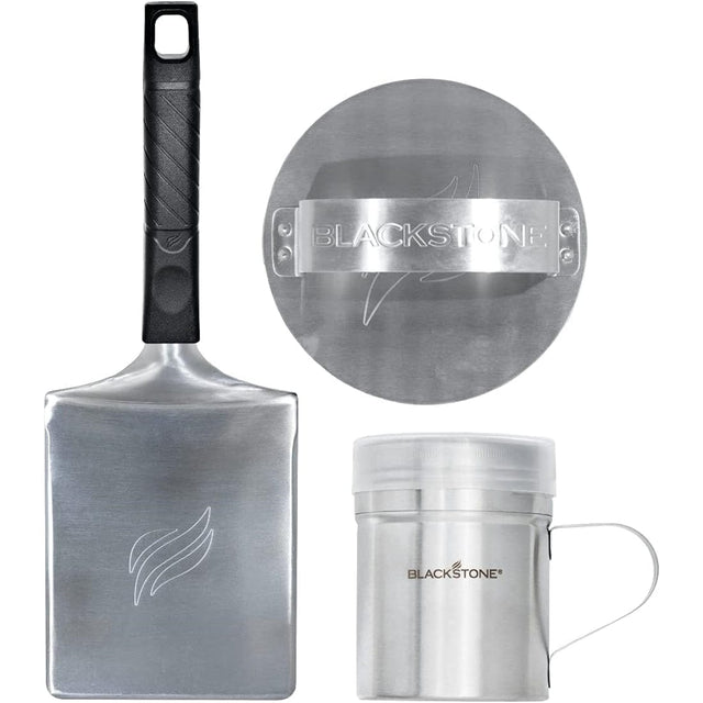This kit features our Press & Sear Burger Tool, 10 oz. Spice Dredge, and heavy duty Hamburger Spatula. The act of smashing your burger is a technique used around the world in the best burger joints. By pressing and searing your burgers you lock in all the flavor, while simultaneously creating that coveted smash burger crust. Use the spice dredge to complete that iconic taste and flavor. The Blackstone heavy-duty wide Hamburger Spatula is ideal for flipping over those monster burgers and steaks. The heavy gauge stainless steel beveled edges make easy work of scraping and cleaning extra food debris off your griddle, making it a two in one product. The Press & Sear Burger Kit will help you to create perfect burgers, anytime, anywhere.